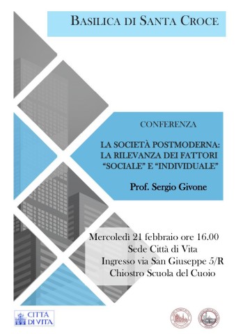 I frati francescani conventuali della Basilica di Santa Croce e l’Associazione Amici di Santa Croce vi invitano Mercoledì, 21 febbraio 2018, alle ore 16,00 alla conferenza del professore Sergio Givone: “La società postmoderna: La rilevanza dei fattori “Sociale” e “individuale”. La conferenza si terrà presso Città di Vita (Basilica di Santa Croce), ingresso via San Giuseppe …