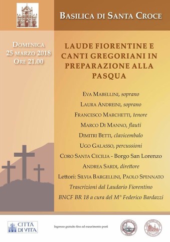 I frati francescani conventuali della Basilica di Santa Croce, L’ Associazione Culturale Amici di Santa Croce, Città di Vita e lo Studio Teologico per Laici di Firenze presentano: Domenica 25 Marzo alle 21.00 Basilica di Santa Croce – Firenze Laude Fiorentine e Canti Gregoriani in preparazione alla Pasqua Una bella occasione per fruire di una …