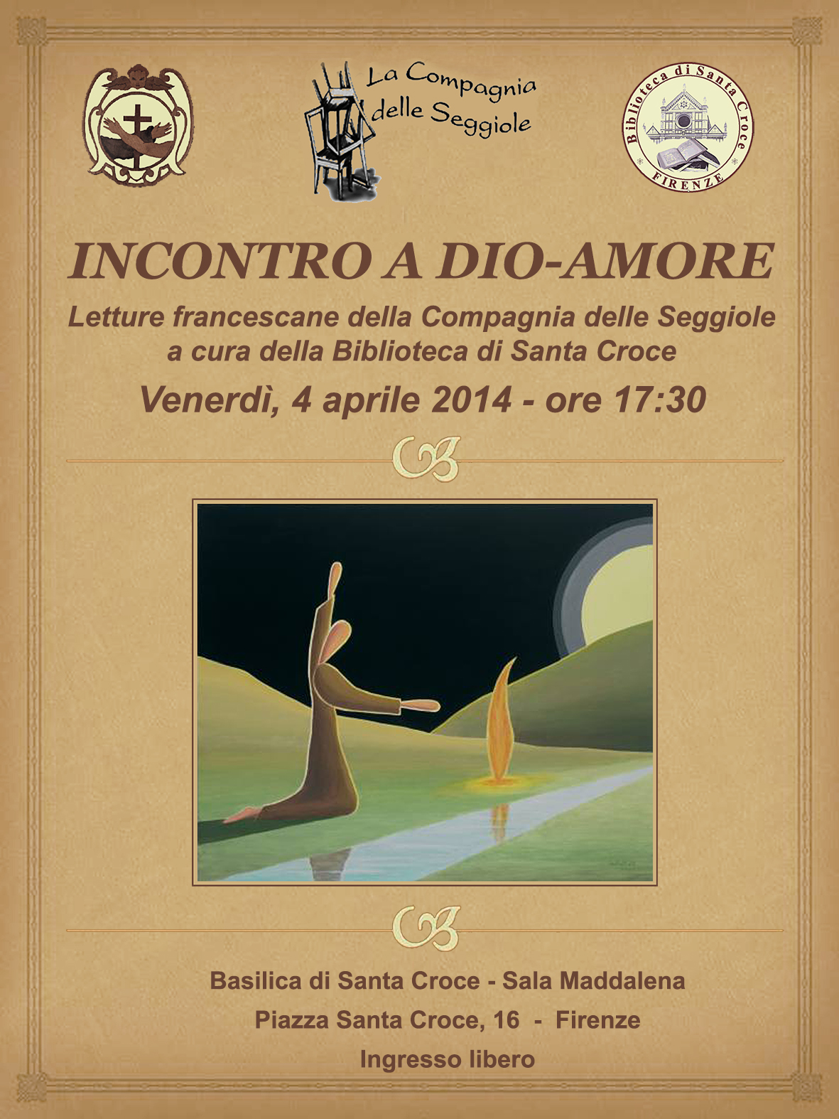 Incontro a Dio-Amore. Letture francescane a Santa Croce, con Fabio Baronti, Luca Marras e Sabrina Tinalli (voci recitanti), evento organizzato dalla Biblioteca di Santa Croce in collaborazione con La Compagnia delle Seggiole. Audio libro fruibile in biblioteca.