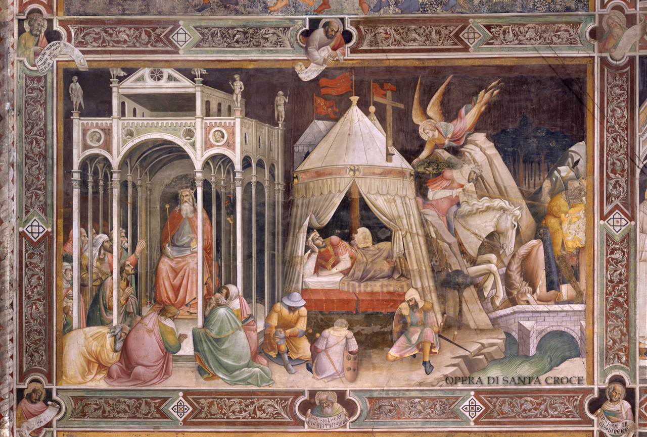 Altri secoli passano e siamo al quarto affresco… Elena, regina e madre di Costantino, giunge a Gerusalemme per ricercare la croce di Cristo. Donna tanto energica e volitiva quanto dotata di una religiosità incrollabile, sapeva quel che voleva, diremmo noi oggi. Nel senso che, per quanto ne sappiamo, sapeva ottenere quel che voleva con le buone o con le cattive…