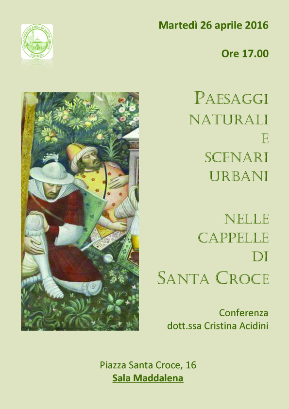 Il 26 aprile, ore 17.00, vi aspettiamo con -Paesaggi naturali e scenari urbani nelle cappelle di Santa Croce- per ‘leggerli’ da vicino, con l’aiuto e la competenza della dott.ssa Cristina Acidini, da un’idea della nostra “Biblioteca di Santa Croce”, la biblioteca della Basilica di Santa Croce