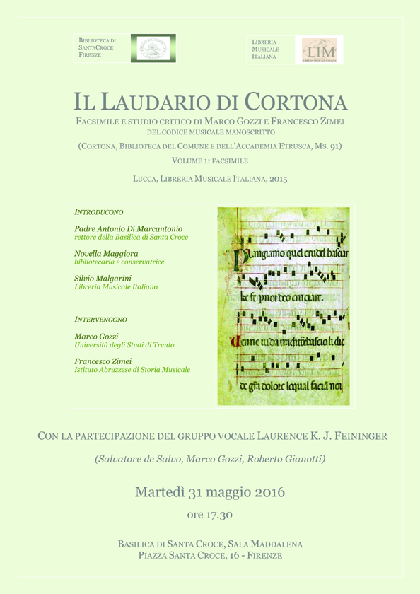 La lauda è l’espressione del sentimento religioso popolare legato alle confraternite. Al 1785, solo nella Firenze all’interno delle mura, si contavano 251 associazioni di tipo laicale. Dopo la loro soppressione, i documenti furono assorbiti dal Patrimonio Ecclesiastico e per la maggior parte riuniti nell’Archivio di Stato di Firenze. Santa Croce ospitava la Compagnia di Santa Maria delle Laudi di Santa Croce, la Compagnia del Gesù, la Compagnia di San Bernardino da Siena, la Compagnia di Santa Maria Maddalena, la Compagnia di San Francesco, detta del Martello, la Compagnia della Natività di Maria Vergine o dei Librai.