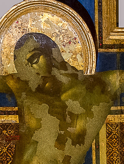Ovunque nella Basilica troviamo il tema della Croce: nella monumentale Croce del Cimabue, un tempo troneggiante sopra l’altare (oggi in sacrestia, restaurata dopo i danni dell’alluvione del 1966); nell’emozionante Croce dipinta dal grottesco “Maestro di Figline”, sopra l’altare maggiore; nella grande vetrata del Ghiberti del rosone della facciata; negli affreschi della Cappella maggiore nei quali si narra la leggenda relativa alle vicende del santo legno, prima e dopo il suo straordinario servizio quale strumento della passione e morte di Cristo.