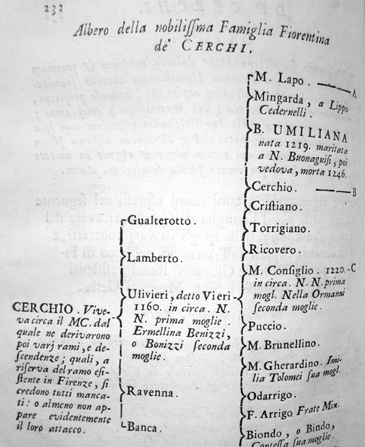 Da erudito quale era, il Brocchi ripropone l’albero della famiglia De’ Cerchi dal XII al 1740.