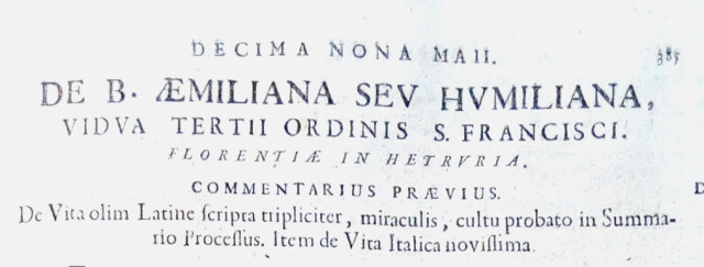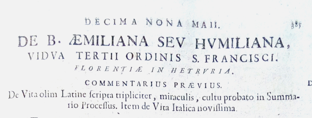 La copia più antica della vita della beata Umiliana è contenuta nel ms. Laurenziano pluteo XXVII destro, cod. XI della Biblioteca Medicea Laurenziana di Firenze: si tratta proprio della vita pubblicata negli Acta Sanctorum con il titolo Vita auctore Vito Cortonensi coaevo, Ordinis Minorum alla quale, sempre negli Acta, seguono i Miracula di Ippolito da Firenze, un compendio della vita e un’altra vita scritta da Raffaele Maffei da Volterra (1451-1522), scriptor apostolicus sotto papa Paolo II, più altri documenti riguardanti il processo di canonizzazione. Il tutto è preceduto dal Commentarius de B. Aemiliana seu Humiliana: i testi riportati dai Bollandisti, infatti, erano corredati da dei commentari che affrontavano le questioni riguardanti la natura dei documenti stessi, studiati quindi con rigore filologico. Questo particolare aspetto determinava il carattere scientifico degli Acta Sanctorum il cui primo volume era uscito, ad Anversa, nel 1643.