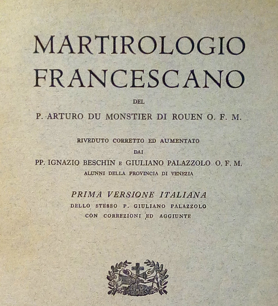 Questi speciali cataloghi si distinguono in generali, dal 1580 conosciuti con il nome di Martyrologium Romanum, e locali, più delimitati. Il cosiddetto Martirologio francescano compilato da père Arthur du Monstier nel 1638 (Paris, 1638, 1653₂), rientra nella seconda categoria. Tradotto e riveduto per essere ripubblicato dalla Tipografia poliglotta vaticana nel 1946, al giorno 19 maggio si può leggere: