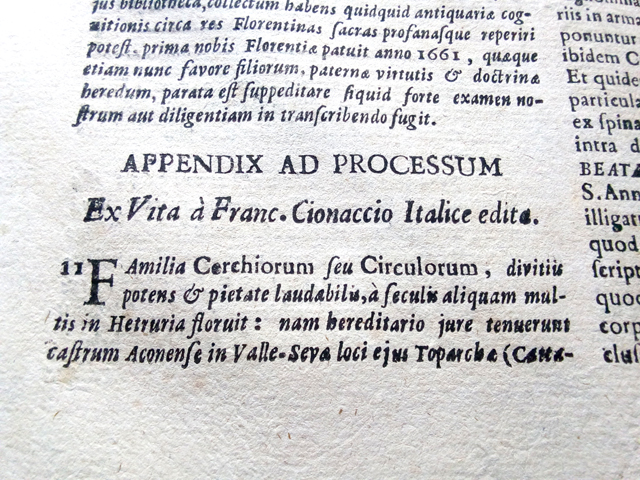 Per iniziativa della famiglia de’ Cerchi, si raccoglieva un materiale dai non pochi pregi, anche perché erano garantite ai posteri ricerche e considerazioni serie, notevoli non solo per la quantità, ma anche per l’approfondimento e per l’impegno nel definire la verità.