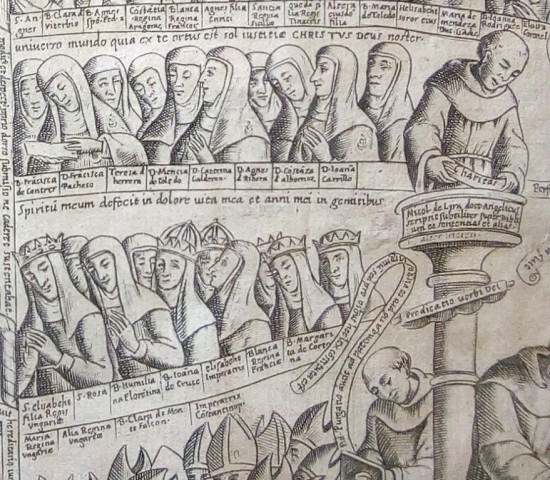 Supplementum et castigatio ad scriptores trium Ordinum S. Francisci .. Umiliana è la seconda da sinistra del registro inferiore, dietro di lei S. Rosa da Viterbo.