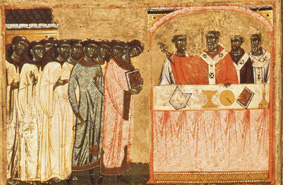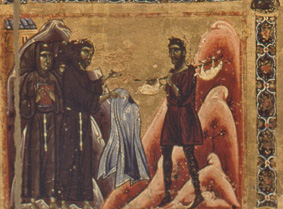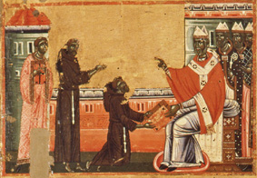 Ancora salendo troviamo la canonizzazione ufficiale di Francesco. A destra il Papa, circondato da prelati, benedice i francescani, non immediatamen- te riconoscibili perché indossano, sopra il saio, le vesti liturgiche.Il corteo è aperto da due religosi che si differenziano dai compagni.Privi di cappuccio, con calze e scarpe e non a piedi nudi, indossano non la semplice veste bianca degli altri, ma frati, ma indumenti di stoffa lavorata. Quello più a sinistra tiene un turibolo in mano, l’altro un codice chiuso e definito; rispetto al compagno ha una veste più suntuosa, con ampie maniche . Tommaso da Celano ricorda che al momento della canonizzazione uno dei suddiaconi del pontefice di nome Ottaviano, lesse i miracoli ad alta voce davanti e tutti e che il cardinale Diacono Rainerio ne fece il commento. Sull’altare cui si appoggia il pontefice sono sparsi alcuni oggetti liturgici; oltre il messale chiuso ve n’è un altro aperto, il discorso della canonizzazione presumibilmente – osserva Chiara Frugoni -.