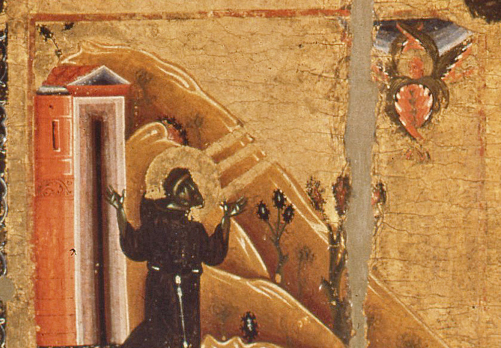 Qaundo Francesco vede il serafino – narra Tommaso da Celano – è triste e lieto insieme; dopo l’apparizione, compaiono le stimmate, anticipazione dei dolori che l’attendono. Francesco prega nel gesto dell’orante; il serafino lo guarda intensamente. Tre raggi d’oro illuminano il santo, trapassando il suo corpo. Francesco prega da solo, senza il conforto o la testimonianza dei compagni, presenti, ad esempio, nell’affresco di Giotto, nella Basilica di Assisi.