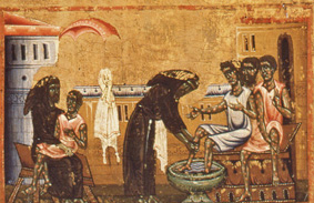 L’altare e il celebrante sono al centro della scena, a sinistra vi sono il diacono e un chierichetto che si inchinano verso di lui; a destra vi è Francesco inginocchiato mentre si toglie i calzari. Il passo del vangelo (Lc 10, 3-4), così recita: “Andate: ecco io vi m,ando come agnelli in mezzo ai pupi; non portate borsa, né bisaccia, né sandali”. Da quell’stante Francesco iniziarà a fare penitenza, predicando il Regno di Dio.