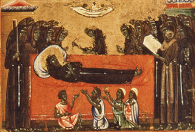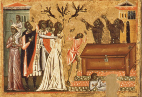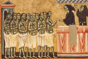 Conclusi questi otto episodi, collocati nella parte terminale della tavola, si comincia ora a risalire, nella parte destra. Vediamo il santo composto sul letto mentre i compagni ceòebrano il rito funebre, alcuni con i ceri accesi, uno con il turibolo, un altro con i paramenti sacerdotali e illibro delle preghiere aprto tra le mani. In cielo gli angeli portano al Padre celeste l’anima di Francesco. Una piccola folla di uomini e donne, storpi e malati, è accorsa ad invocare la guarigione.