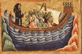 Questo e l’episodio successivo sono dedicati alla stessa vicenda: alcuni marinai anconetani, sorpresi da una tempesta, invocano san francesco e si salvano. Miracolo di cui la tavola Bardi è l’unica attestazione conosciuta. Questo episodio mostra Francesco sull’imbarcazione. Questo miracolo, dopo la morte, può trovare un parziale riscontro nel Trattato dei miracoli di Tommaso da Celano. Ai marinai, che invocano Francesco, appare una grande luce che calma ilmare. Qui, invece il pittore ha rappresentato Francesco nell’atto di benedire e rassicurare i marinai dentro la barca.;probabilmente il pittore ha voluto sostituire la luce (difficilmente rappresentabile) con la figura di Francesco