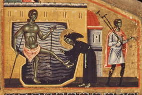 L’immagine sembra realizzare una delle più antiche testimonianze riguardo agli inizi dell’Ordine: Giaco da Vitry, dopo avere sottolineato l’estrema umiltà dei frati e il loro amore per la povertà nel seguire i precetti e i consigli della vita evangelica, aggiunge: “rinunciando ad ogni proprietà, rinnegando se stessi, prendendo la loro croce, nudi seguono Cristo nudo. Come Giuseppe depongono il loro mantello e corrono…davanti al volto del Signore”