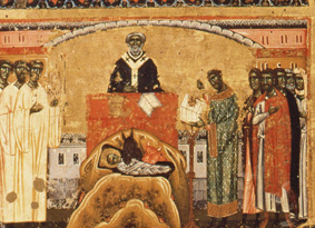 Nei precedenti episodi, Francesco si mostra estramamente ossequiente alla gerarchia ecclesistica, addirittura inginicchiato (Lettura del vamgelo e Approvazione della Regola), nel Natale di Greccio è in posizione defilata, stretto nel gruppo dei laici e, solo la veste diaconale, lo stacca dai laici