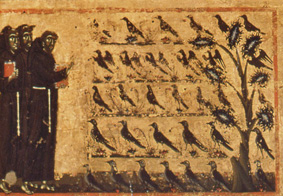 Tomaso da Celano enumera le specie di uccelli che ascoltano la predica del santo: “Erano raccolti insiem moltissimi uccelli d’ogni specie, colombe, cornacchie e monachine”. Spesso nella letteratura medievale, le varie categorie di uccelli stanno ad indicare stati diversi della società; ad esempio, gli uccelli da preda, strumento di caccia per i signori, ne sono spesso il simbolo (cfr. F. Cardini, Federico II e il De arte venandi cum avibus in Politicae Cultura dell’Italia di Federico II”, Pisa 1986).