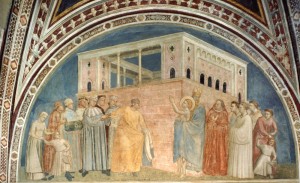 Ma guardiamo bene cos’ha dipinto Giotto. Qui c’è il padre di Francesco: è fuori di sé dall’ira…C’è anche la mamma, è intenta a cercare di trattenerlo dal fare uno sproposito. Proprio non riesce a capire perché il figlio, che poteva avere le sue ricchezze, e vivere nell’agio del mondo, disprezzasse e rifiutasse entrambe… E poi faceva il matto, a suo dire, e ne combinava di tutti i colori. “Meglio essere invidiati che compatiti…” [tono di spocchia] Questo è il motto degli Assisani perbene: ricchi, prepotenti, arroganti.