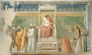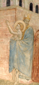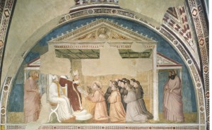 Guardate, guardate bene l’affresco: ci sono il padre e la madre da una parte, il Vescovo e Francesco dall’altra, attorno gli Assisani perbene, gli astanti, apparentemente indifferenti, e invece ferocemente curiosi, e magari lieti di vedere l’avido mercante ridotto a implorare rabbiosamente la restituzione del maltolto. Solo ai lati vedete messer Giotto mette due bambini che vorrebbero vedere capire, e tirano per farsi tirare su a cavalluccio per osservare la scena, ma le fantesche li trattengono: “Non sta bene… forza a casa a casa…” E’ una scena terribile: Ridammi ciò ch’è mio…ridatemi il figlio mio … ridatemi Francesco… [urla, rivolgendosi in giro come cercando appoggio dagli assisani perbene]